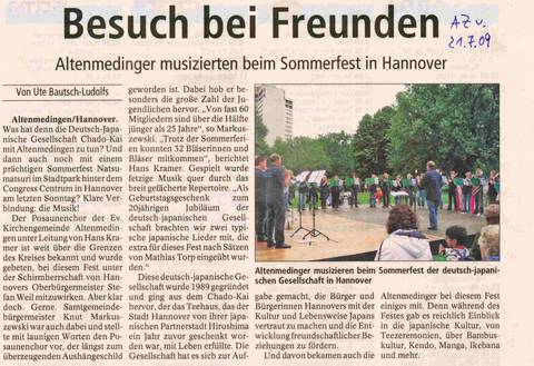 Am 13.7.2009 waren wir also in Hannover beim deutsch-jap. Sommerfest, das trotz des unbeständigen Wetters mit ca. 4000 Besuchern ein voller Erfolg gewesen ist. Das Programm hatte Highlights bis hin zum Auftritt des Diabolo-Weltmeisters aus Japan mit unwahrscheinlichen Kunststücken. An drei Stellen waren die Altenmedinger mit ihrer Musik in das Programm eingebaut.Zur Begrüßung spielten wir zwei japanische Volkslieder, dann eine bunte Mischung aus unserem Repertoire, das offensichtlich gut ankam. Wir wären durchaus bereit, das im nächsten Jahr zu wiederholen.